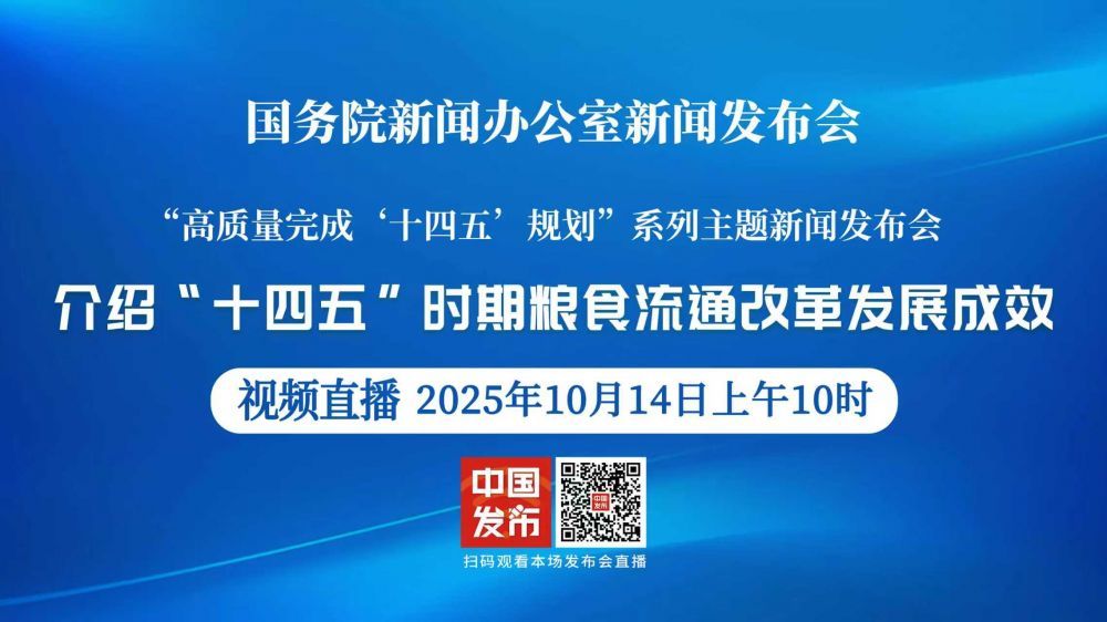 国务院新闻办公室于2025年10月14日(星期二)上午10时举行“高质量完成‘十四五’规划”系列主题新闻发布会,请国家发展改革委党组成员、国家粮食和储备局局长刘焕鑫介绍“十四五”时期粮食流通改革发展成效,并答记者问。