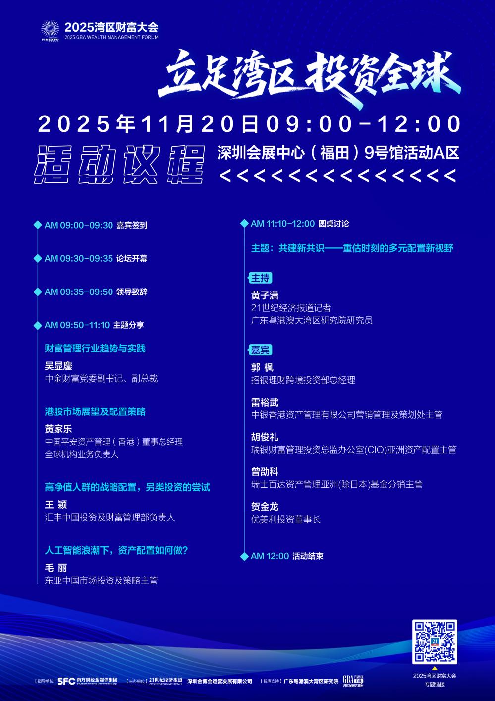 11月20日,2025湾区财富大会将于深圳会展中心(福田)9号馆举办。大会由21世纪经济报道、深圳金博会运营发展有限公司联合主办。作为第十九届金博会的重要主题论坛之一,2025年湾区财富大会聚焦全球资产配置、跨境财富管理等前沿议题进行探讨,同时从资产端到资金端、从政策端到市场端,多维度拆解财富管理行业痛点,为行业转型提供全业态解决方案。