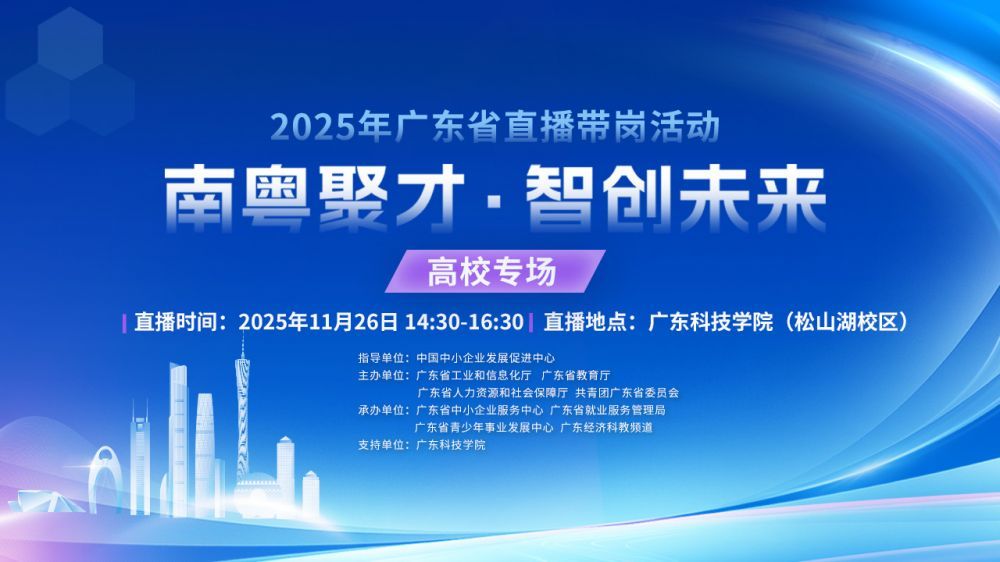 南粤聚才,智创未来!2025年广东省直播带岗活动将在2025年7月-12月开展40场线上招聘会,本场是第40场。本次为【高校专场】直播活动,将全程通过经视频APP进行直播。直播时间为2025 年11月26日14:30-16:30,敬请期待!