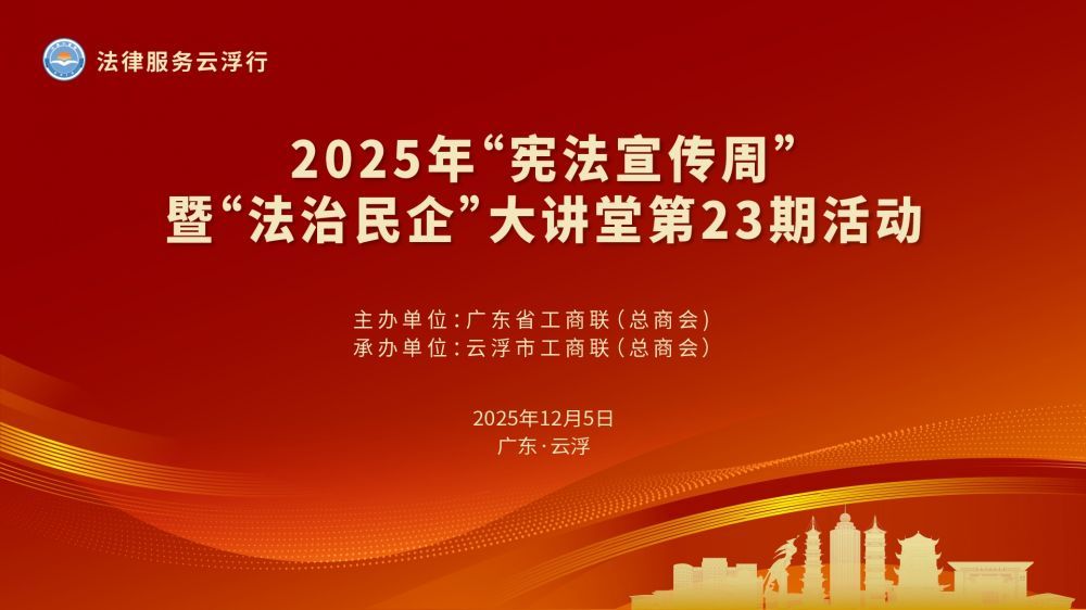 为全面贯彻落实党的二十届四中全会精神和省委“1310”具体部署,深入开展“法律服务地市行”,结合“宪法宣传周”活动,进一步加强《中华人民共和国宪法》和《广东省现代企业制度建设促进条例》等普法宣传,广东省工商联定于2025年12月5日,在云浮举办2025年“宪法宣传周”暨“法治民企”大讲堂第23期活动。本次活动以线上、线下相结合的方式举办。