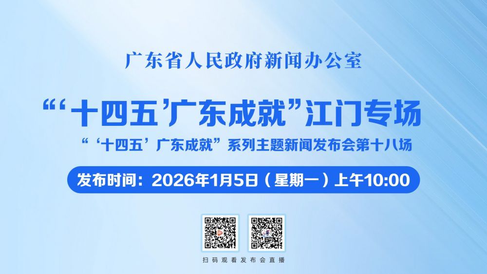 广东省人民政府新闻办公室定于2026年1月5日上午10时在广州市广东大厦三楼国际会议厅举行“‘十四五’广东成就”江门专场新闻发布会,邀请江门市人民政府主要负责人作主发布,江门市发展和改革局、科学技术局、工业和信息化局、文化广电旅游体育局主要负责人参加,介绍“十四五”期间江门市经济社会发展总体情况和成效亮点,并回答记者提问。