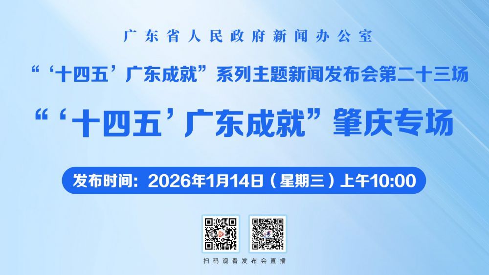 广东省人民政府新闻办公室定于2026年1月14日上午10时在广州市广东大厦三楼国际会议厅举行“‘十四五’广东成就”肇庆专场新闻发布会,邀请肇庆市人民政府主要负责人作主发布,肇庆市发展和改革局、工业和信息化局、交通运输局、农业农村局主要负责人参加,介绍“十四五”期间肇庆市经济社会发展总体情况和成效亮点,并回答记者提问。