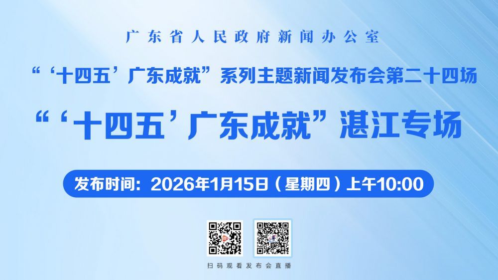 广东省人民政府新闻办公室定于2026年1月15日上午10时在广州市广东大厦三楼国际会议厅举行“‘十四五’广东成就”湛江专场新闻发布会,邀请湛江市人民政府主要负责人作主发布,湛江市发展和改革局、工业和信息化局、交通运输局、海洋与渔业局主要负责人参加,介绍“十四五”期间湛江市经济社会发展总体情况和成效亮点,并回答记者提问。