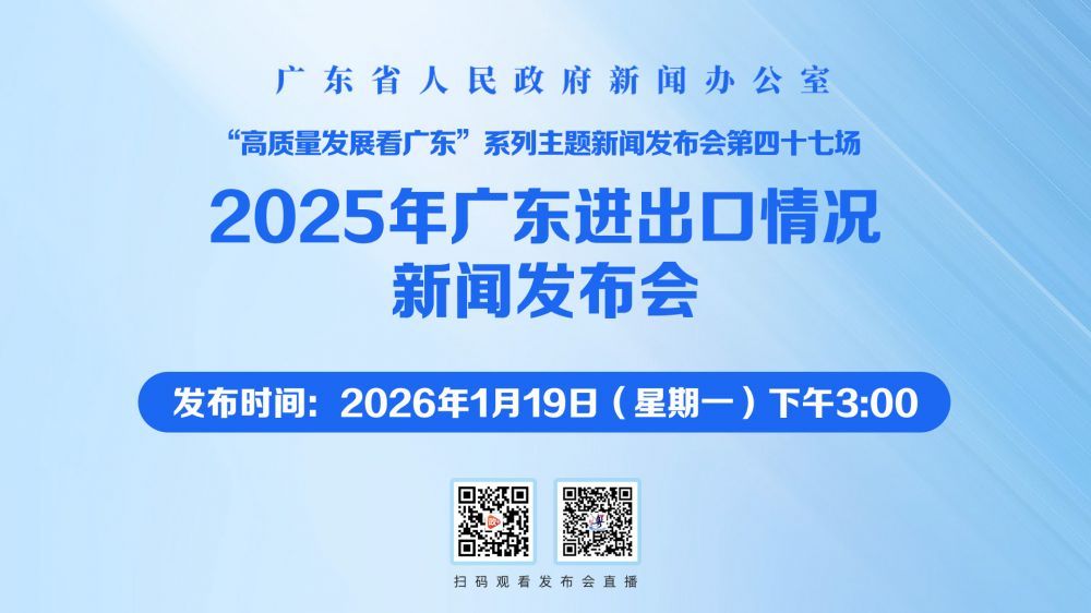 广东省人民政府新闻办公室定于2026年1月19日下午3时在广东大厦三楼国际会议厅举行2025年广东进出口情况新闻发布会,邀请海关总署广东分署、广州海关、深圳海关、拱北海关负责人出席发布会并回答记者提问。