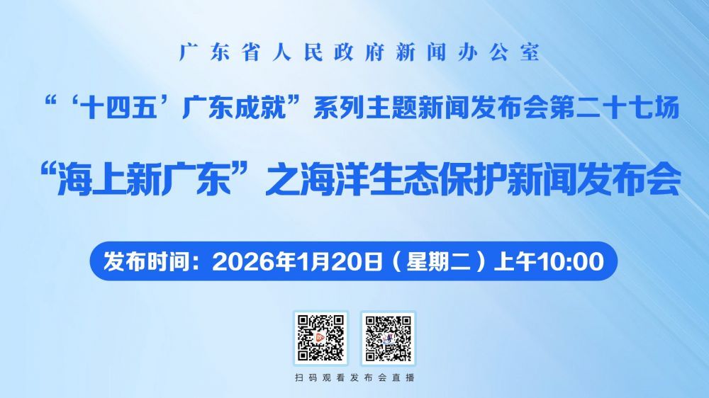 广东省人民政府新闻办公室于2026年1月20日上午10:00在广州市广东大厦三楼国际会议厅召开“海上新广东”之海洋生态保护新闻发布会,邀请广东省自然资源厅、广东省生态环境厅主要负责人作主发布,广东省农业农村厅、广东海事局相关负责人参加,介绍“十四五”时期广东省海洋生态保护修复等情况和成效,并回答记者提问。