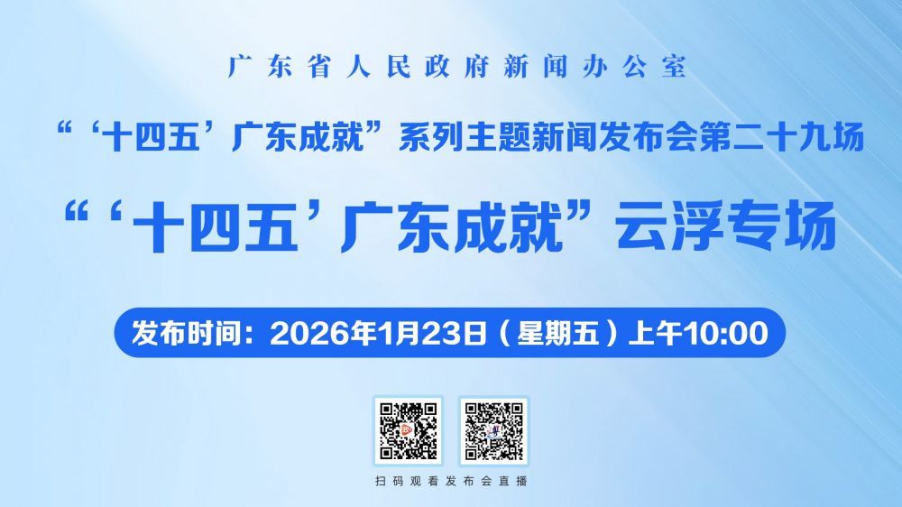广东省人民政府新闻办公室定于2026年1月23日上午10时在广州市广东大厦三楼国际会议厅举行“‘十四五’广东成就”云浮专场新闻发布会,邀请云浮市人民政府主要负责人作主发布,云浮市公安局、工业和信息化局、生态环境局、市场监督管理局主要负责人参加,介绍“十四五”期间云浮市经济社会发展总体情况和成效亮点,并回答记者提问。