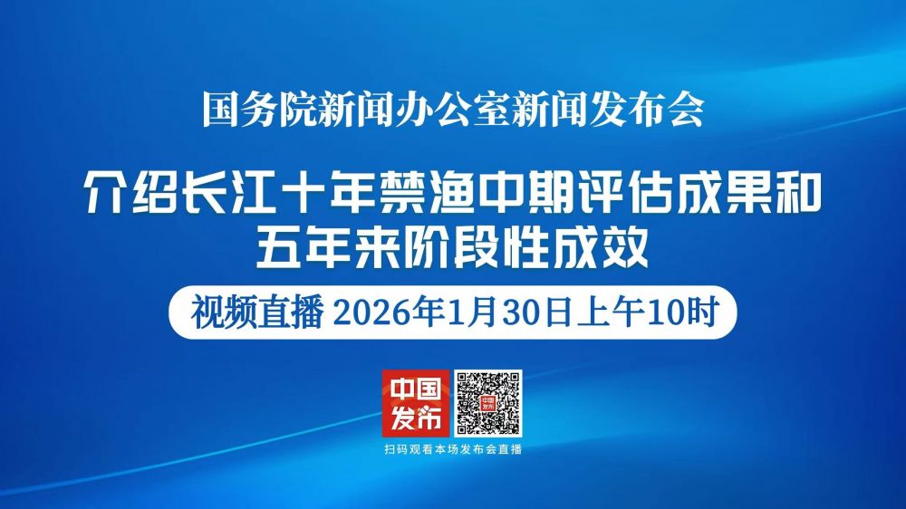 国务院新闻办公室于2026年1月30日(星期五)上午10时举行新闻发布会,请农业农村部副部长张治礼,长江十年禁渔中期评估专家组组长、中国科学院院士桂建芳,长江十年禁渔中期评估工作组组长、复旦大学党委副书记方明介绍长江十年禁渔中期评估情况,并答记者问。