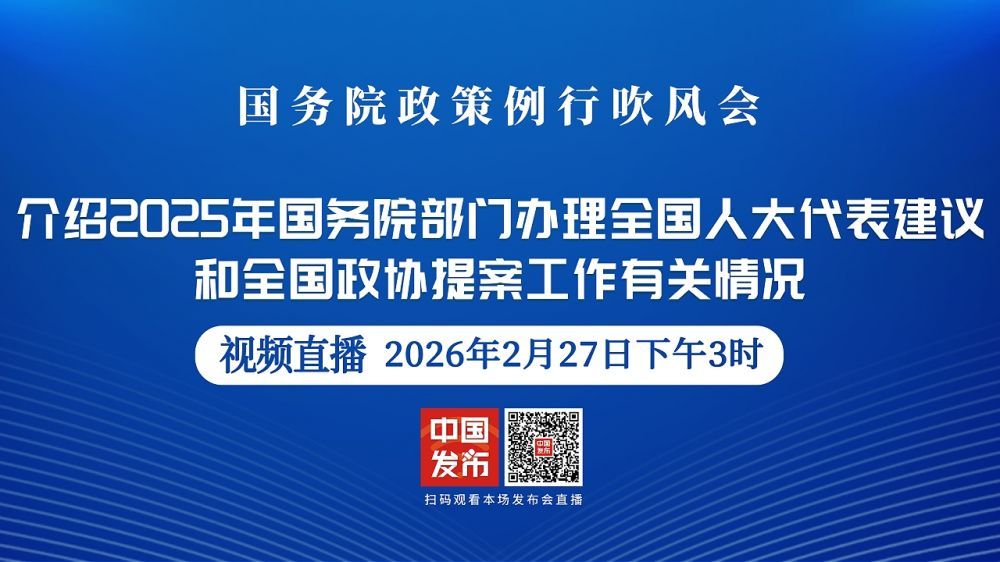 国务院新闻办公室将于2026年2月27日(星期五)下午3时举行国务院政策例行吹风会,请科学技术部党组成员、秘书长潘晓东,农业农村部国家首席兽医师(官)、计划财务司司长陶怀颖,商务部副部长鄢东,国家市场监督管理总局副局长、国家标准化管理委员会主任邓志勇和国务院新闻办公室新闻发言人介绍2025年国务院部门办理全国人大代表建议和全国政协提案工作有关情况,并答记者问。
