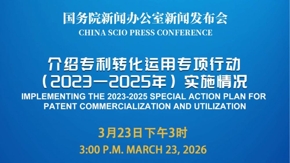 国务院新闻办公室将于2026年3月23日(星期一)下午3时举行新闻发布会,请国家知识产权局副局长胡文辉和教育部、工业和信息化部、金融监管总局有关负责人介绍专利转化运用专项行动(2023—2025年)实施情况,并答记者问。