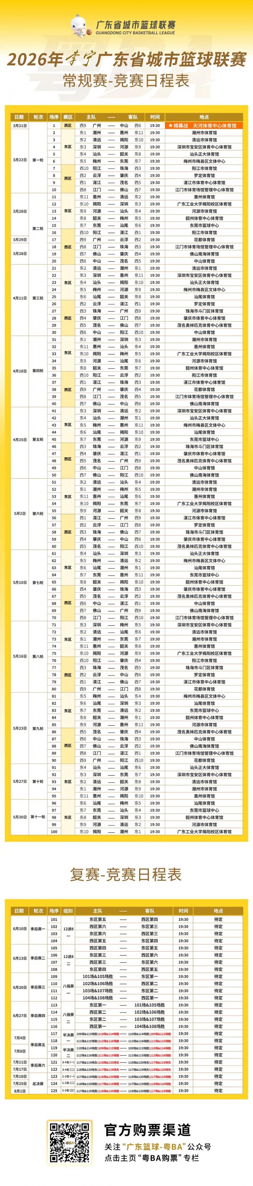 一战城名,粤战粤勇!广东省城市篮球联赛(粤BA)首轮常规赛事于3月22日在全省9座城市继续进行。据悉,本届粤BA赛事覆盖全省21个地级市,基本以珠江为界划分为东区11支、西区10支队伍,常规赛+淘汰赛共计125场比赛,持续到8月份。我们将对粤BA所有场次赛事进行全程直播,打造“全天候赛事窗口”,让球迷们轻松锁定每一场精彩,让每场赛事都能拥有专属高光时刻,敬请关注!
