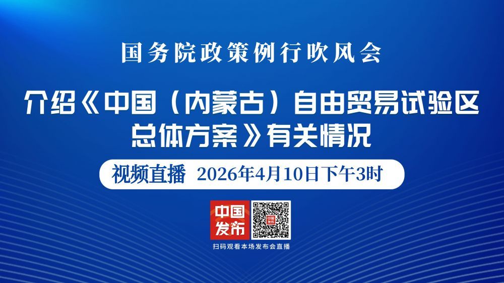 国务院新闻办公室于2026年4月10日(星期五)下午3时举行国务院政策例行吹风会,请商务部部长助理袁晓明,内蒙古自治区党委常委、自治区常务副主席黄志强介绍《中国(内蒙古)自由贸易试验区总体方案》有关情况,并答记者问。