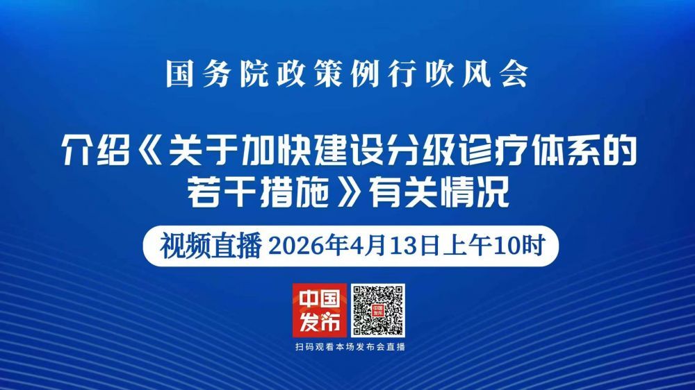 国务院新闻办公室将于2026年4月13日(星期一)上午10时举行国务院政策例行吹风会,请国家卫生健康委副主任郑哲和国家医保局有关负责人介绍《关于加快建设分级诊疗体系的若干措施》有关情况,并答记者问。