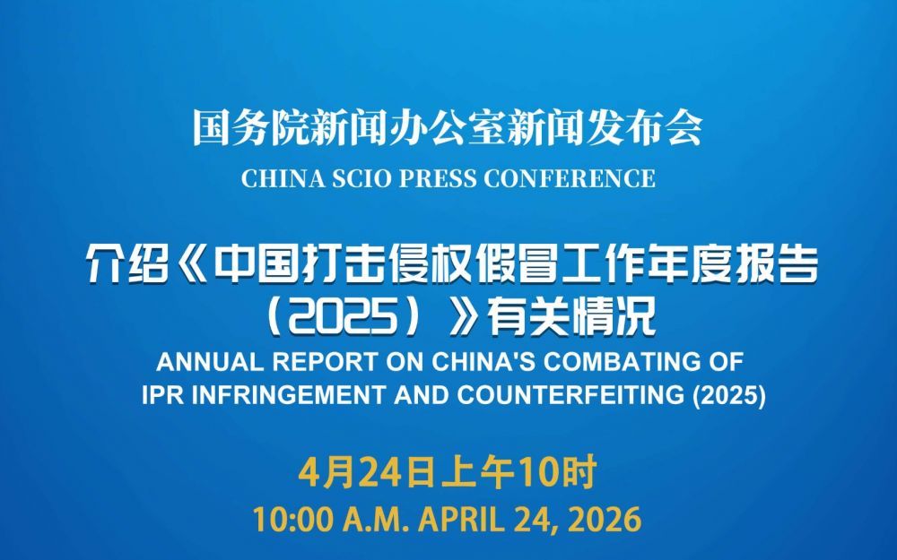 国务院新闻办公室将于2026年4月24日(星期五)上午10时举行新闻发布会,请市场监管总局副局长白清元介绍《中国打击侵权假冒工作年度报告(2025)》有关情况,并答记者问。