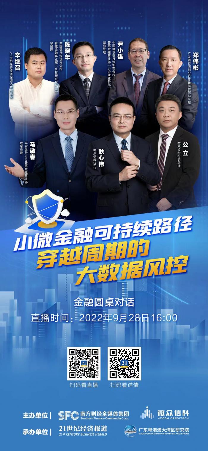 为支持实体经济,监管政策一直引导建立“敢贷、愿贷、能贷、会贷”的长效机制,近年来小微企业信贷投放呈高速增长态势。引“金融活水”浇灌实体经济,尤其是支持小微企业,需要监管、商业银行、征信机构和社会各方面一起努力。为梳理总结金融支持小微企业的经验,寻找小微金融可持续发展的路径,由南方财经全媒体集团、微众信科联合主办,21世纪经济报道、广东粤港澳大湾区研究院联合承办的金融圆桌研讨会系列之“小微金融可持续路径:穿越周期的大数据风控”,将邀请众多机构嘉宾展开讨论。