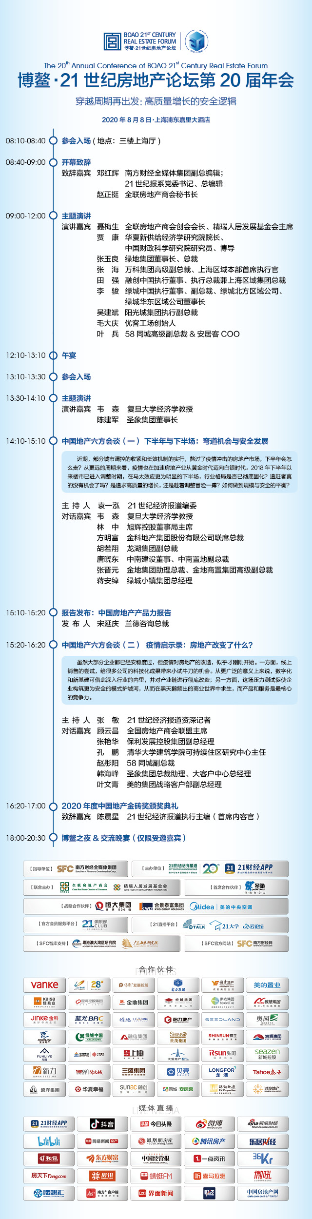 2020年8月8日在上海浦东嘉里大酒店举行,本届年会的主题为——穿越周期再出发:高质量增长的安全逻辑。博鳌·21世纪房地产论坛由《21世纪经济报道》于2001年发起主办,全联房地产商会、精瑞人居发展基金会联合主办。