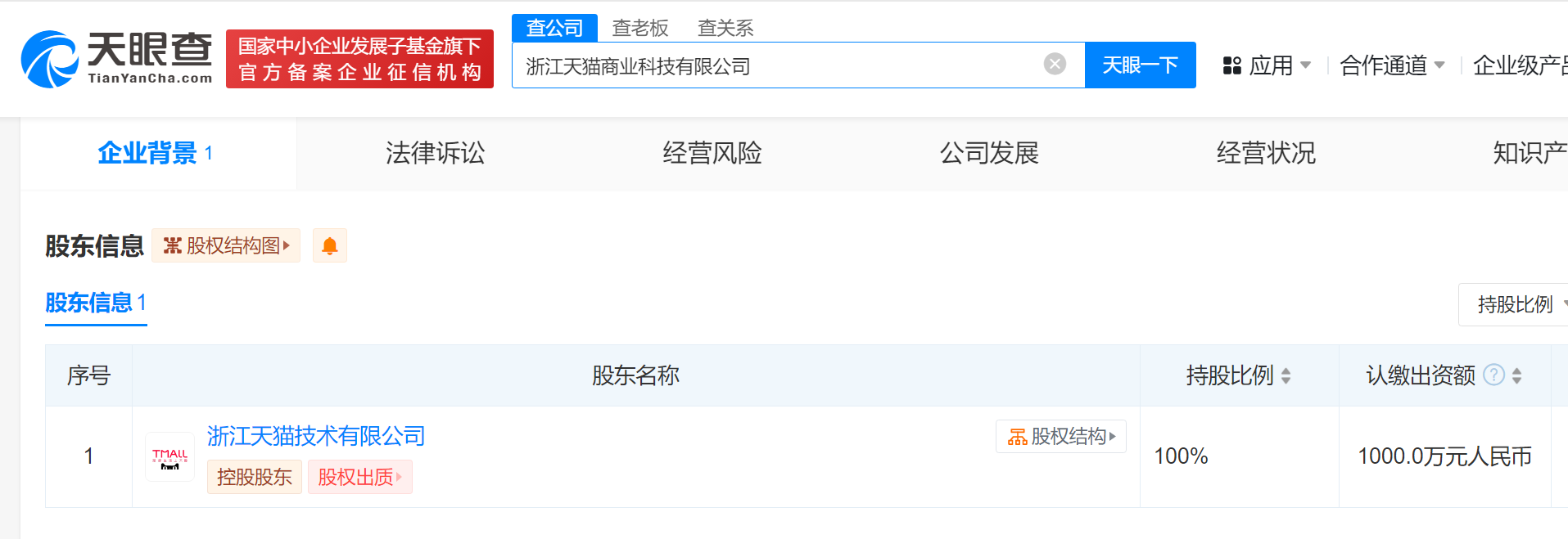 南方财经4月30日电,天眼查App显示,近日,浙江天猫商业科技有限公司成立,法定代表人为刘洋,注册资本1000万人民币,经营范围含互联网销售、通信设备销售、单用途商业预付卡代理销售、计算机软硬件及辅助设备零售、信息系统运行维护服务、供应链管理服务等。股东信息显示,该公司由浙江天猫技术有限公司全资持股。