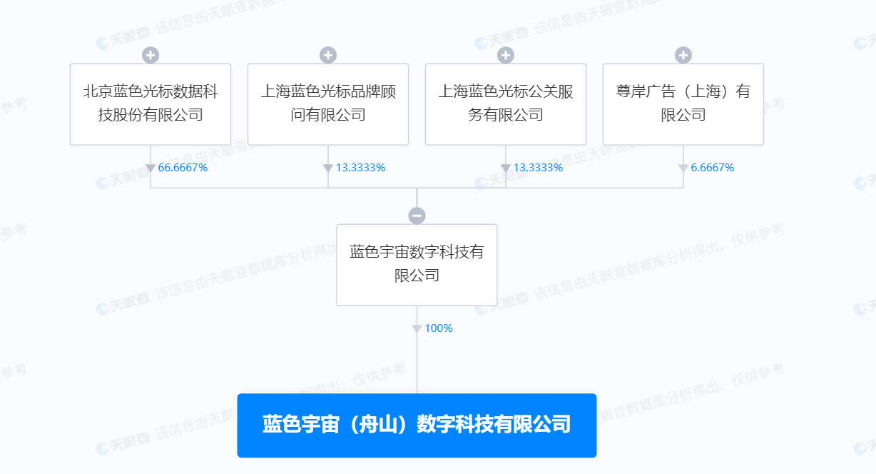 南方财经2月6日电,天眼查App显示,2月4日,蓝色宇宙(舟山)数字科技有限公司成立,法定代表人为钟明,注册资本2000万人民币,经营范围含广告制作、互联网数据服务、软件开发、信息系统集成服务、市场营销策划、项目策划与公关服务等。股权全景穿透图显示,该公司由蓝色光标(300058)旗下蓝色宇宙数字科技有限公司全资持股。