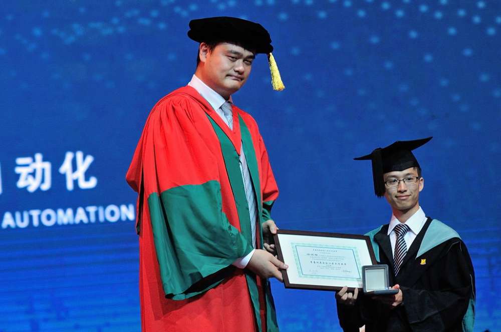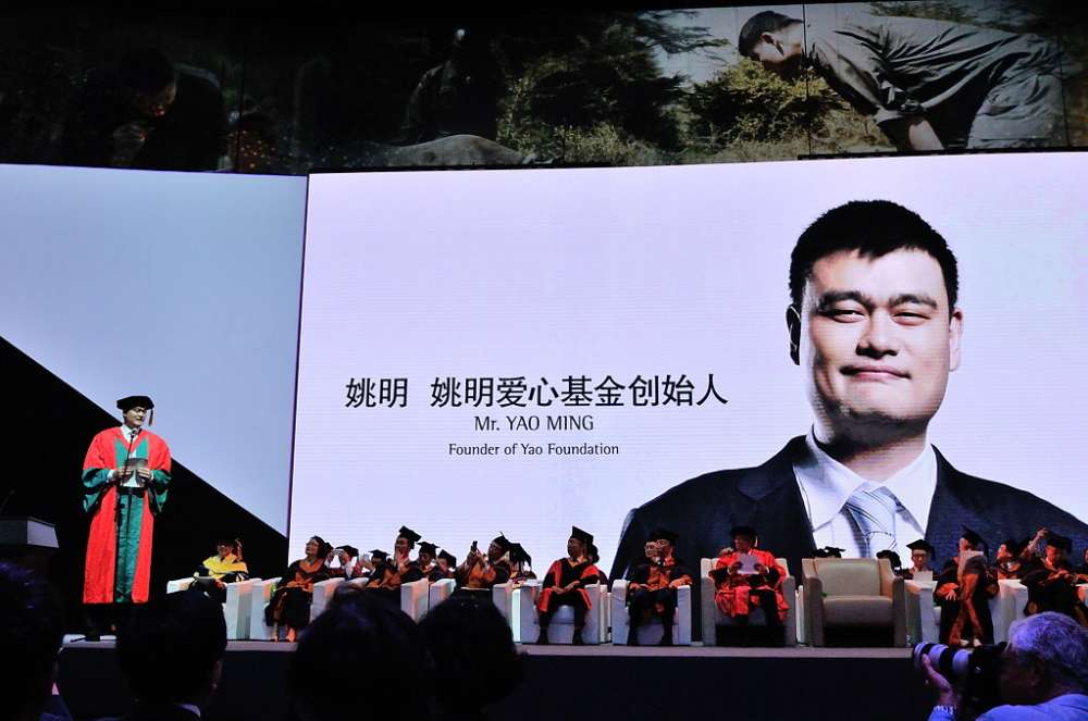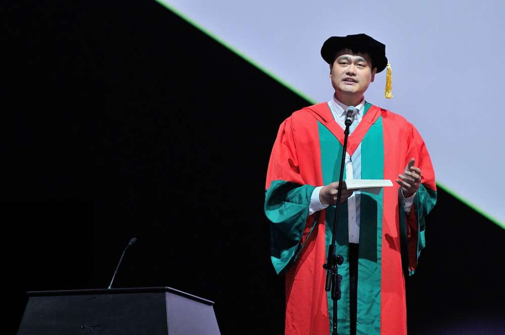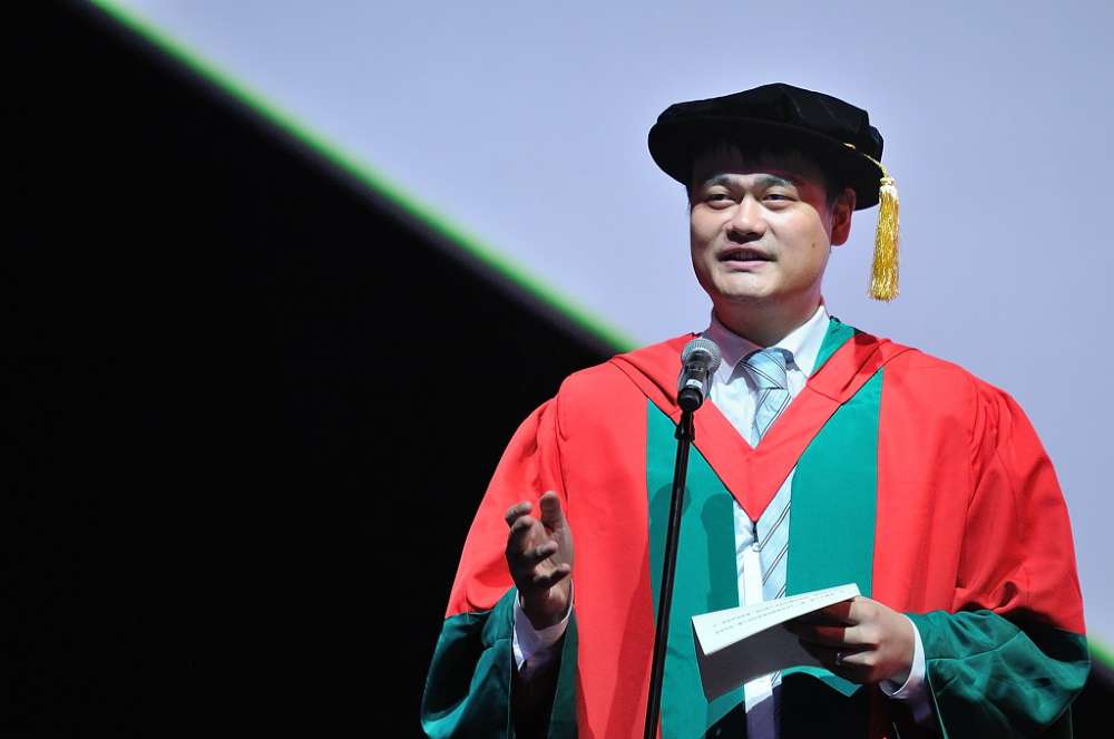 毕业典礼开始前,步入会场的姚明。姚明的身高达2.29米。2011年7月,姚明宣布将结束自己的运动生涯。澳大利亚《悉尼先驱晨报》对此评论说:姚明在其具有开创性质的职业篮球生涯中使自己成为中国最知名的运动员,并帮助促进了篮球运动在全世界的发展。他用自己的名望来对抗中国人在一系列问题上的禁忌,他号召人们改变对待艾滋病毒感染者的方式,还呼吁中国人抵制鱼翅汤。