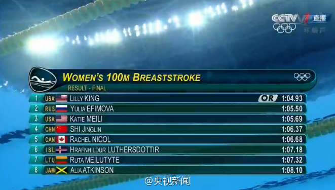 里约奥运会女子100蛙决赛中,史婧琳1分06秒37第四!