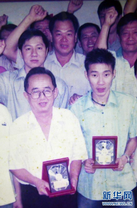 这是成名后的李宗伟(前排右)与启蒙教练郑炳发(前排左)的合影(8月11日翻拍照片)。马来西亚羽毛球名将李宗伟的启蒙教练郑炳发接受新华社采访说,当时李宗伟10岁,第一次看到李宗伟打球觉得这个孩子“古灵精怪,身体很灵活”,于是劝李宗伟学打球。