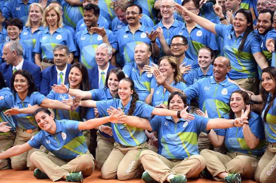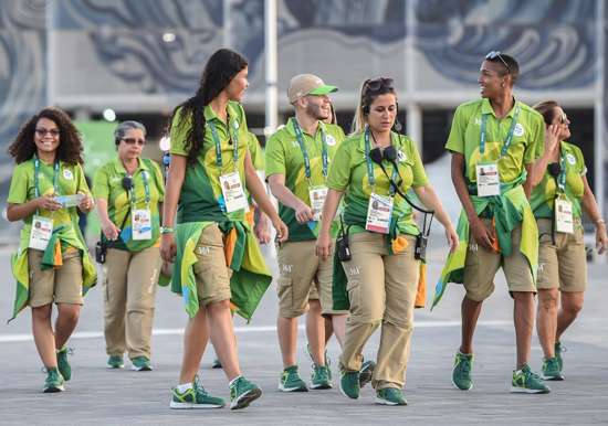 图为巴哈奥林匹克公园内一群穿着361度服装的工作人员(8月1日摄)。361度公司是里约奥运会官方支持商,是第一家赞助夏季奥运会的中国体育用品品牌,为里约奥运会和残奥会正式比赛和所有测试赛的技术官员、医疗人员、赛事运行区域服务人员、公共区域服务人员以及火炬传递等专项活动参与者提供整套专业运动装备。“算上礼仪、裁判等服装,一共提供了39万件。”361度总裁丁伍号说。新华社记者 刘大伟 摄