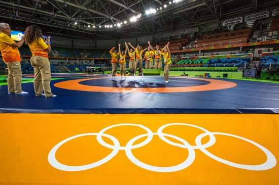 图为在里约奥运会摔跤场馆内,场馆工作人员和志愿者在摔跤垫上拍照(8月18日摄)。本届奥运会的摔跤垫来自中国山东泰山体育集团。作为四届奥运会器材供应商,泰山体育在本届奥运会上为跆拳道、柔道、摔跤、田径、自行车等11个大项提供了近万件器材。此外,本届奥运会跆拳道、摔跤、柔道三个项目以泰山体育的产品标准作为器材标准。新华社记者 刘彬 摄
