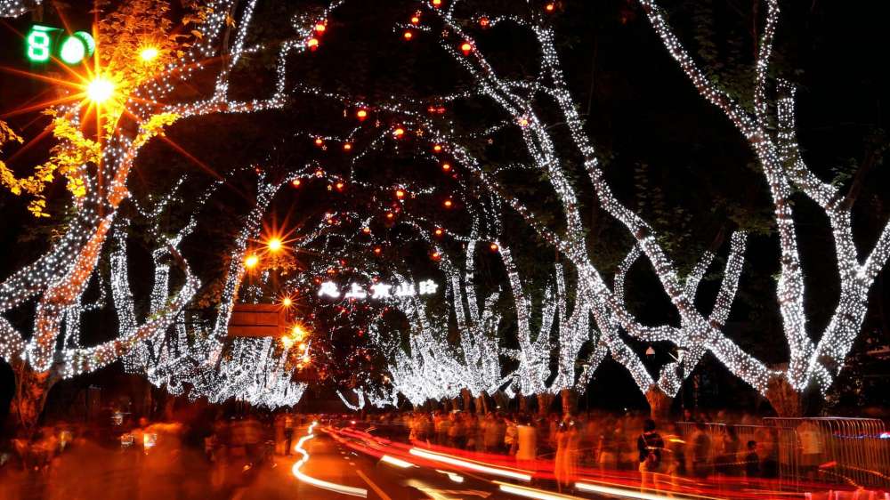 游客欣赏杭州南山路夜景(8月31日摄)。新华社记者殷刚摄