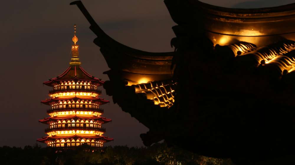 杭州雷峰塔夜景(左,8月31日摄)。 新华社记者殷刚摄