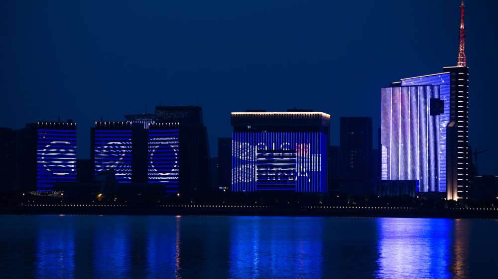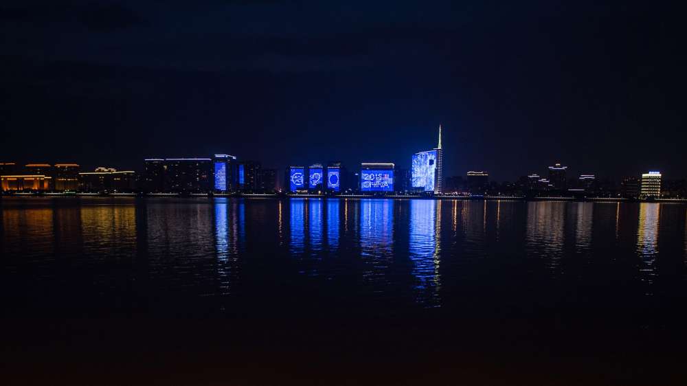 杭州钱塘江岸边建筑的主题灯光秀(8月31日摄)。新华社记者李响摄