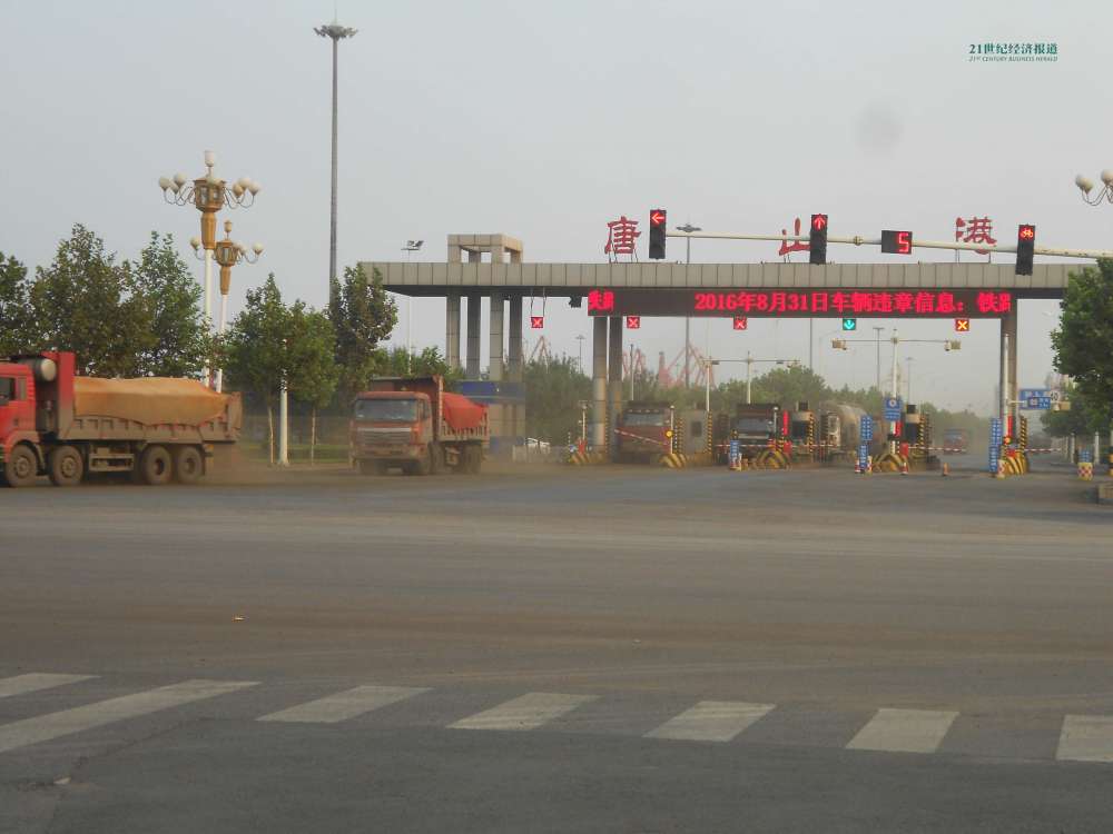 9月4日从京唐港到迁安的平青乐线到处是成群结队的重卡货车,已经将路面压坏。(摄影/21世纪经济报道)