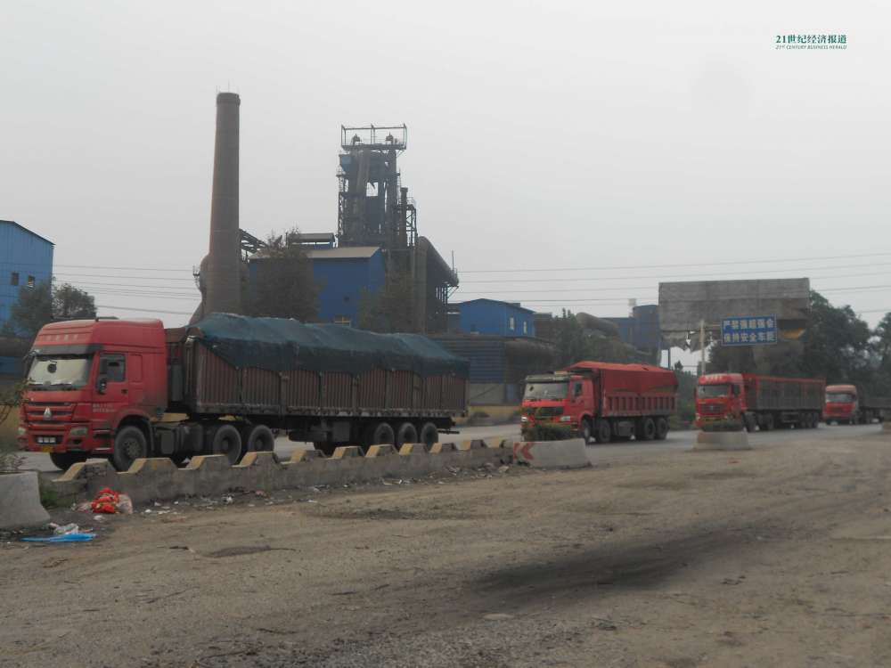 这是滦县榛子镇102国道的车,一辆接一辆,大都是运输铁矿石或者钢材,背后的炉子属于兴隆钢铁公司。(摄影/21世纪经济报道)