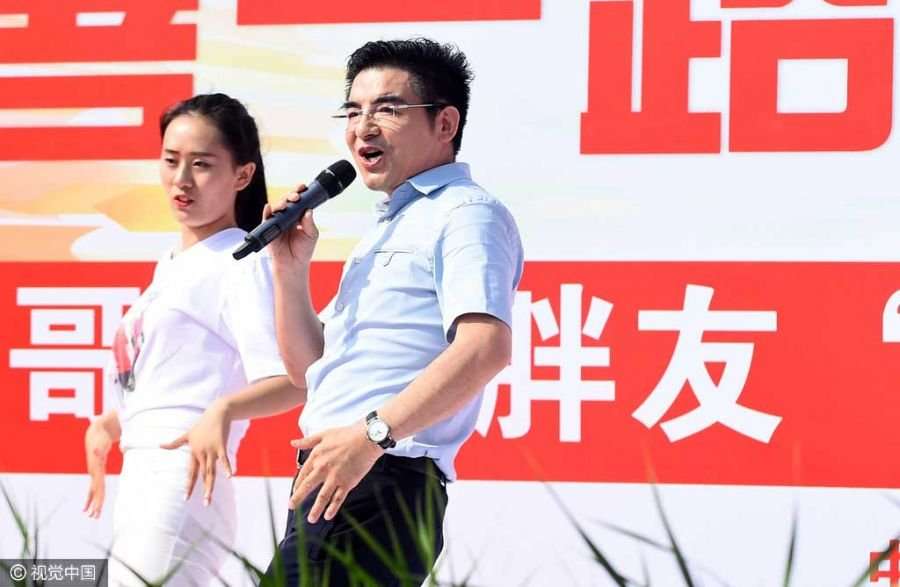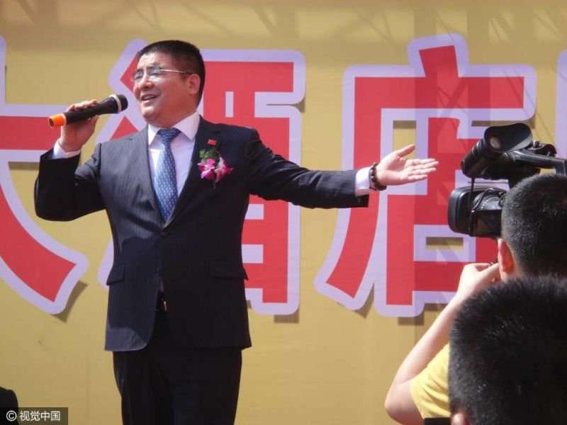 2014年10月06日,江苏省镇江市,镇江火车站售票处的北广场一家饭店正在开业,有着“中国首善”之称的陈光标献唱其原创歌曲,现场其儿子还表演了钢琴独奏。