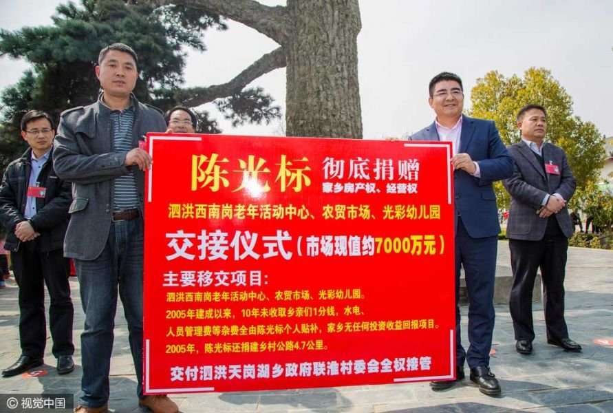 2015年04月11日,江苏宿迁,陈光标在其家乡、江苏省泗洪县天岗湖乡举行捐赠交接仪式,将其全资建设的泗洪西南岗老年活动中心、农贸市场、光彩幼儿园的产权和经营管理权全部移交给当地政府。