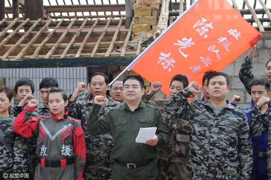 2014年10月09日,云南景谷,陈光标在云南普洱地震震中七七村带领救援队员宣誓。