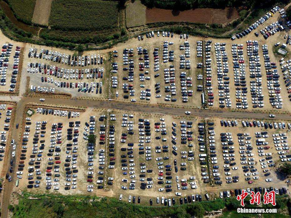 10月4日,河南登封嵩山少林寺进入黄金周客流高峰期,前来游览少林寺的民众人潮涌动。景区内各大停车场内也是密密麻麻,近万辆汽车停放在一起,犹如电路板,甚是壮观。