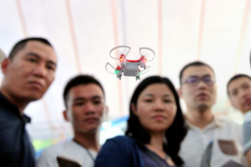 汕头市飞鹰科技有限公司向参观者展示的一款袖珍型(约半个手掌大)多旋翼无人机。飞行高度为50米,并可进行图片和视频拍摄。