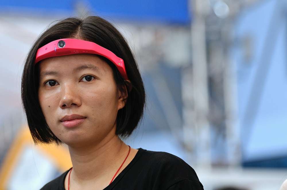 头戴“X1星影”摄像机的深圳福云明网络科技有限公司的营销人员。使用者可以一边跑步一边拍摄。