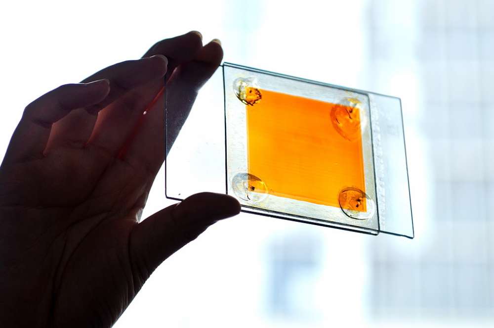 南京大学旗下南京清辉新能源有限公司展示的一款石墨烯太阳能电池。其在弱光下即可输出电流,且较传统的晶硅太阳能电池成本低。前者还具有透明、柔韧的特点。