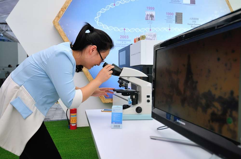创客工坊区,一位参观者正在观察显微镜里的干酪乳杆菌。它是深圳华大基因研究院研制的“复合益生菌压片糖果”中包含的一种菌类。