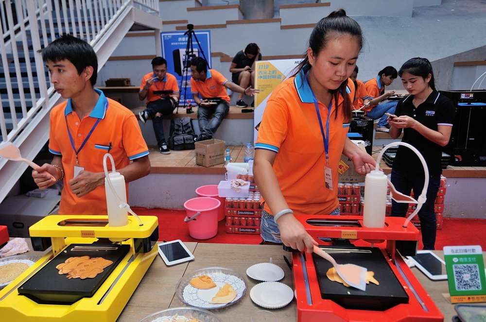 深圳优锐科技有限公司的工作人员正在展示一款HUEWAY“煎饼打印机”。