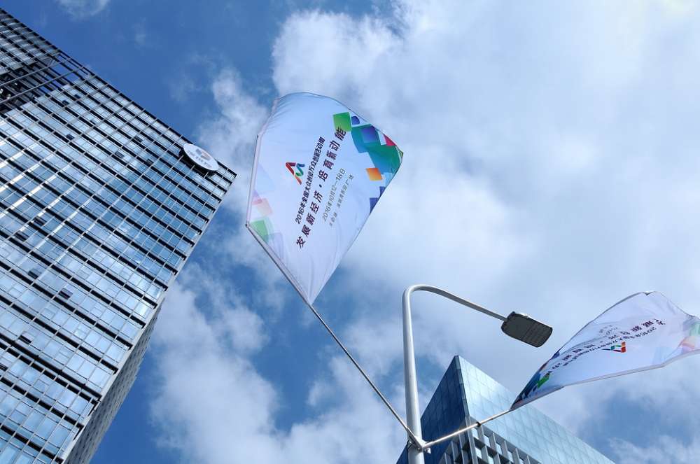 主会场附近道路灯杆上的宣传旗帜。本届活动的主题为:发展新经济,培育新动能。
