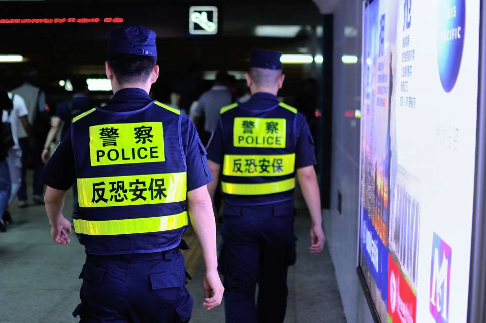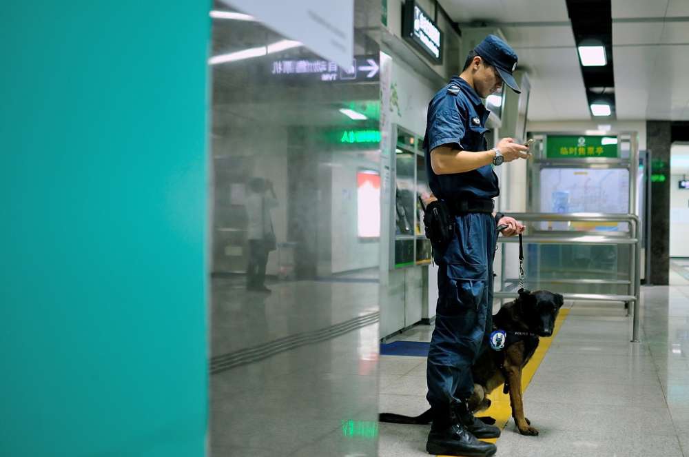 距离主会场最近的深圳地铁科苑站站厅里,一位警员和警戒中的意大利马犬。