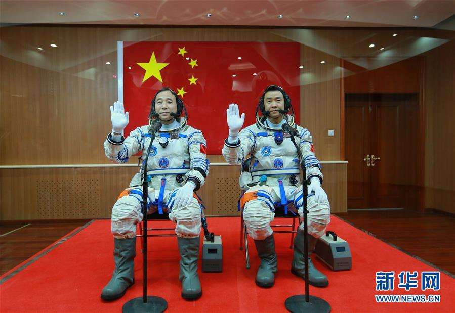10月17日,神舟十一号航天员出征仪式在酒泉卫星发射中心举行。这是航天员景海鹏(左)、陈冬在出征前挥手。(图片来源:新华网)