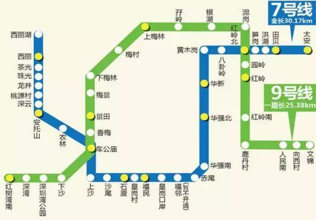 9号线又称“梅林线”,西起红树湾南,东至文锦,横跨南山、福田、罗湖3区,设了梅景、下梅林、梅村、上梅林、孖岭、住梅林5个站,小伙伴再也不用担心公交堵!