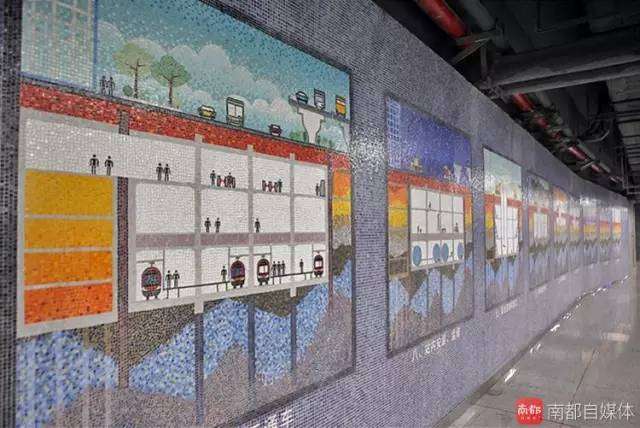 不过讲真,最让人惊艳的还是9号线“内涵”,站内的艺术墙太有情怀,一起来感受下~图为车公庙站,马赛克做成的地铁建设图解