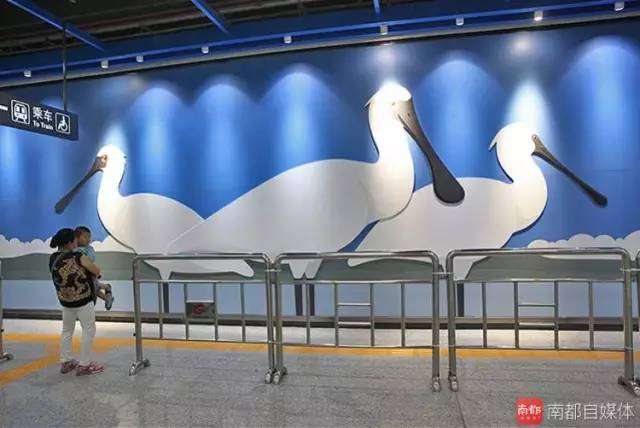 红树湾南站。这是最靠近红树林保护区的车站之一,深圳湾红树林是黑脸琵鹭仅存不多的栖息地。设计者说,想借此传达:生态保护不易!