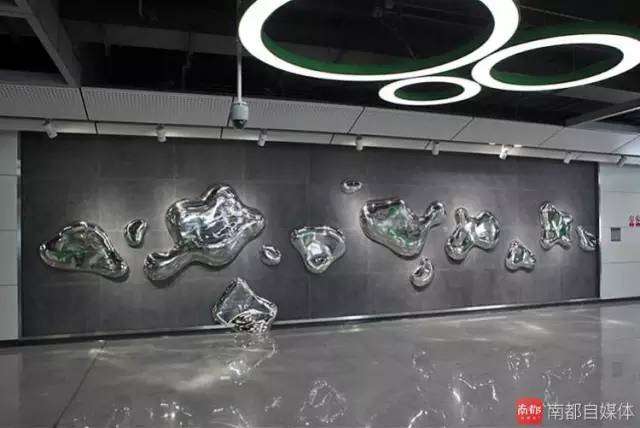 珠光站的《清晨》。这是通过镜面不锈钢材料锻造成的一个个突出的小露珠,当人们走过这些小露珠旁边,“露珠”似乎变成了童年玩过的“哈哈镜”。