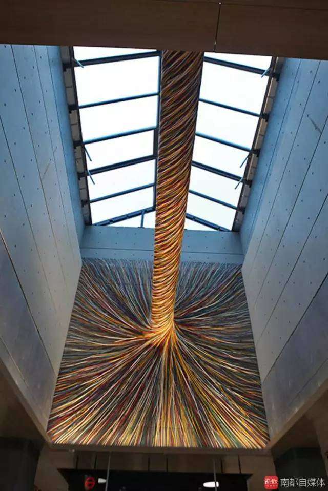 这个作品叫《粼粼》,作品使用镜面不锈钢与柔软的纤维材质结合,塑造出波光粼粼的效果。