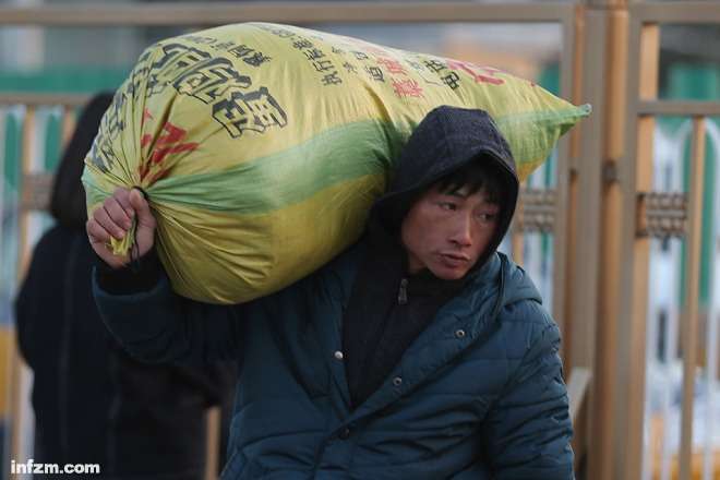 北京西站广场上,一名旅客扛着大包行李准备进站。(南方周末记者 张涛、翁洹/图)