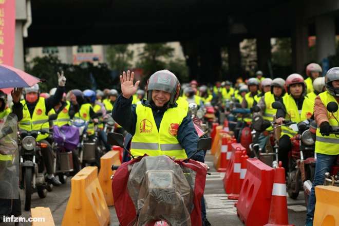 1月13日,2017年春运第一天,广东中石化为一万名摩托返乡骑手加一箱免费汽油,在佛山龙山加油站,陆彬一大早和老乡工友来到加油站加上一箱免费汽油后,这也意味着他们结束了一年的打工生活,即将回到温暖的老家。(南方周末记者 张涛、翁洹/图)